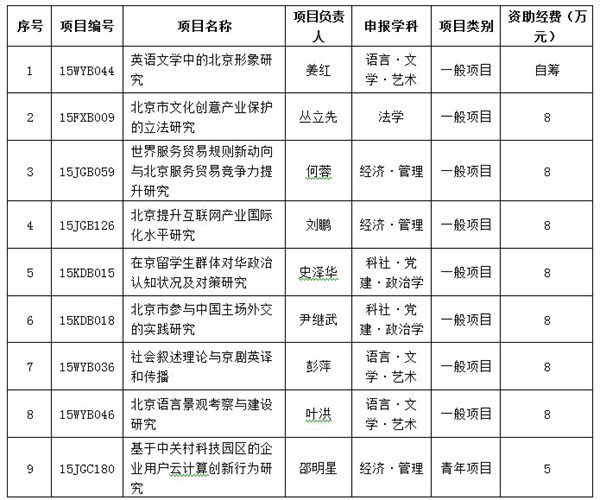 近日,北京市社科规划办公布了2015年北京市社科基金年度项目立项名单。我校9项课题获得立项资助,其中青年项目1项、一般项目8项,课题立项数量与上一年度持平,共计获得课题经费61万元。
